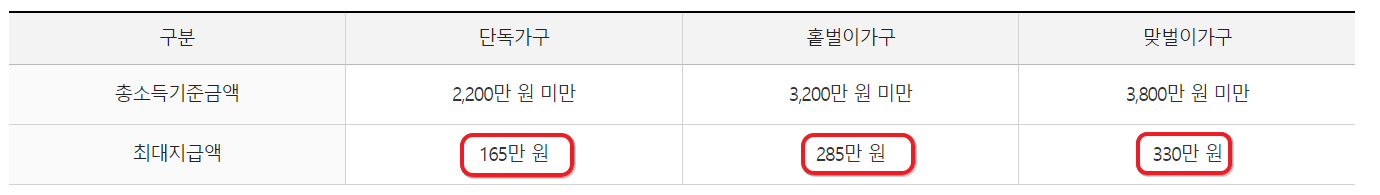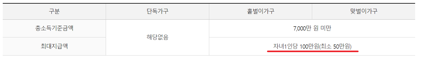 저소득 가구의 자녀양육을 지원하기 위해 총소득(부부합산) 7,000만원 미만이면서 부양자녀(18세 미만)가 있는 경우 1인당 최대 100만원(최소 50만원)을 지급하는 제도로 총소득 기준을 제외한