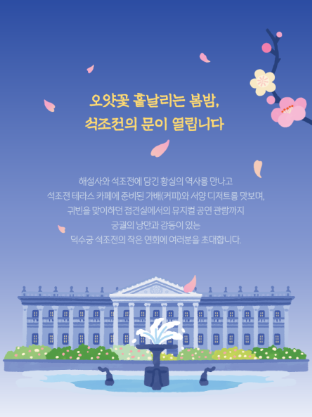 해설사와 석조전에 담긴 황실의 역사를 만나고 석조전 테라스 카페에 준비된 가배(커피)와 서양 디저트를 맛보며, 귀빈을 맞이하던 접견실에서의 뮤지컬 공연 관람까지 궁궐의 낭만과 감동이 있는 덕수궁 석조전의 작은 연회에 여러분을 초대합니다."