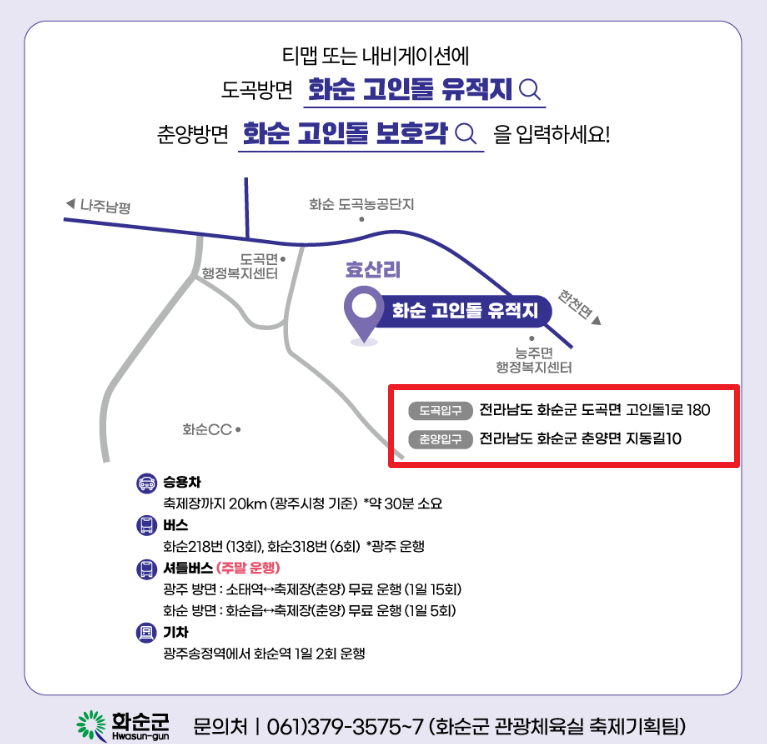 - 화순고인돌봄꽃축제에서는 관광객을 위한 셔틀버스를 운행합니다.