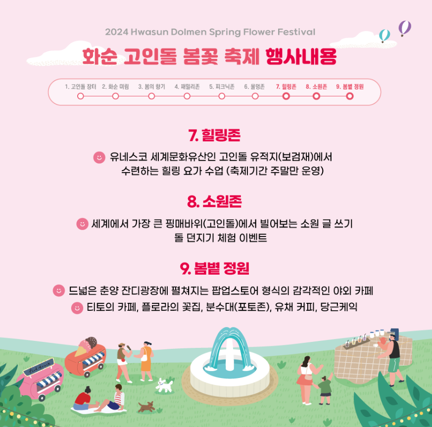- 고인돌장터 → 화순미림 → 봄의 향기 → 패밀리봄 → 피크닉존 → 물멍존 → 힐링존 → 소원존 → 봄볕정원