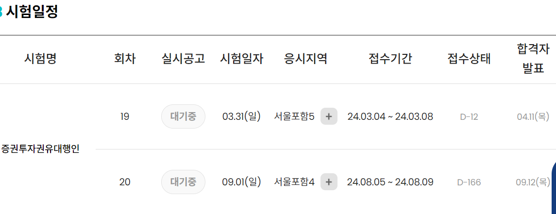 증권투자권유대행인 시험은 1년에 2회 상반기, 하반기에 시행 됩니다. 상반기는 3월 초 접수기간을 거처 3월 31일(일)에 시험에 응시하고 하반기는 8월초 접수기간을 거처 9월 1일(일)에 시험에 응시하게 됩니다.