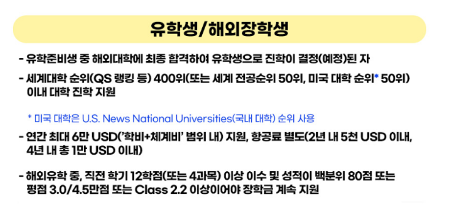 - 대한민국 국적 24년 현재 국내 고등학교 2학년 또는 3학년 재학생 중 해외대학 입학을 희망하는 저소득층(기초생활수급자, 차상위계층) 우수고등학생