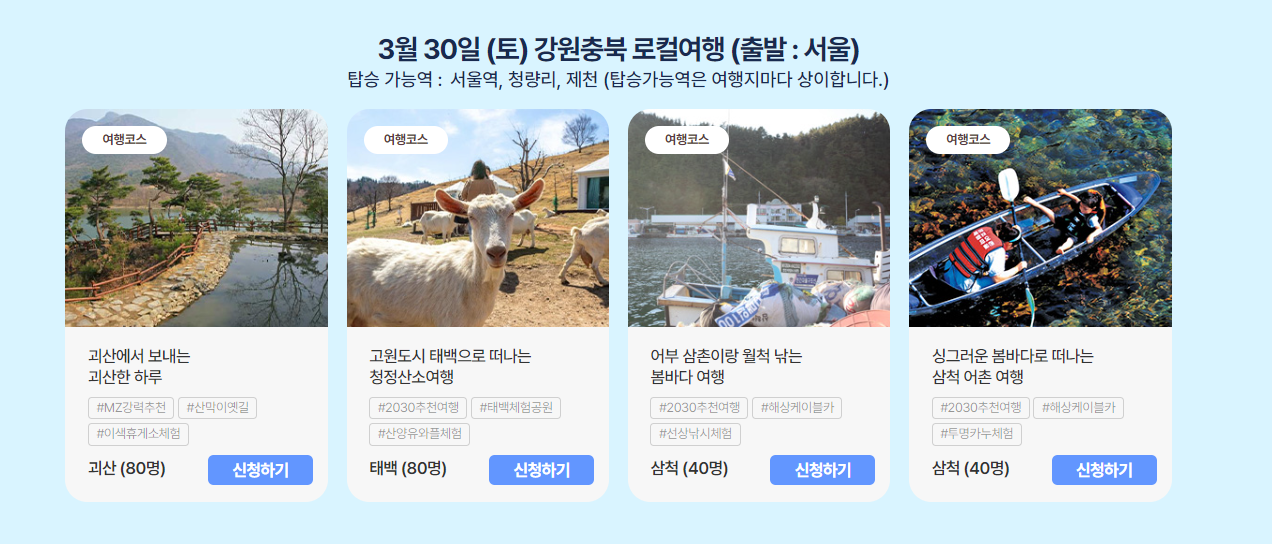 대한민국 구석구석 국내여행을 통해 지역관광 활성화를 위해 문화체육부, 한국관광공사와 전국 지차체, 관광업계가 함께 추진하는 캠페인으로 다양한 할인혜택과 여행프로그램 및 이벤트가 제공되는' 3월엔 여기로 여행가는 달, 기차로 떠나는 로컬여행'을 운영한다고 합니다. 1차, 2차, 3차로 나눠서 진행되고 각각 차수별, 지역별로 여행테마가 다르니 취향껏 신청하시면 됩니다.
