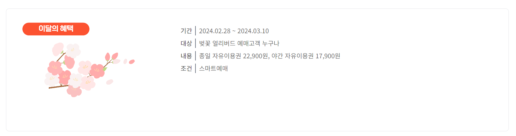 벚꽃 얼리버드 특가 : 지금 예매하면 최대 53% 할인을 받을 수 있는 초특가 찬스로 구매할 수 있습니다.