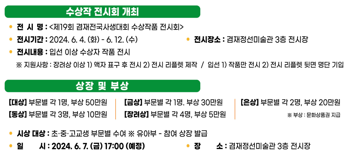 - 참가분야 : 모든 장르(한국화, 서양화, 수채화, 파스텔화, 만화, 일러스트, 디자인 등)