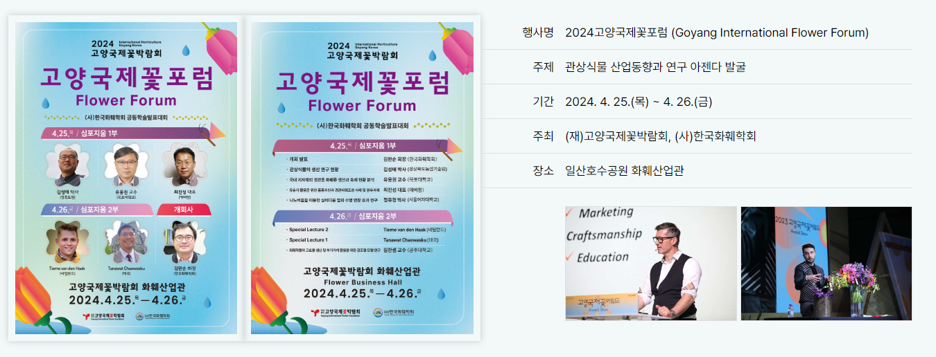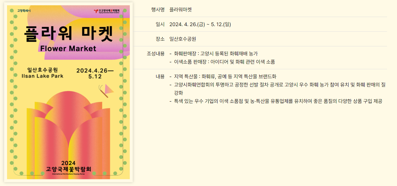 4월 26일 부터 5월 12일까지 일산 호수공원에서 개최되는 고양국제꽃박람회는 세계 각국의 다양한 꽃과 정원을 만날 수 있는 특별한 행사입니다. 올해는 더 확장된 행사규모로 24만 제곱미터의 면적에 세계의 꽃들이 '지구환경과 꽃'을 주제로 열리며 30개국50개 도시 200여개 기관, 기업이 참여하는 세계최고의 화훼박람회입니다. 야외 화훼전시, 실내 화훼전시, 고양플라워그랑프리, 고양국제꽃어워드쇼, 고양국제꽃포럼, 공연 및 이벤트, 고양플라워마켓 등 많은 행사와 볼거리가 가득한 고양국제꽃박람회에 대해 알아보겠습니다.