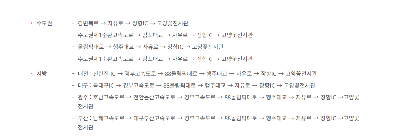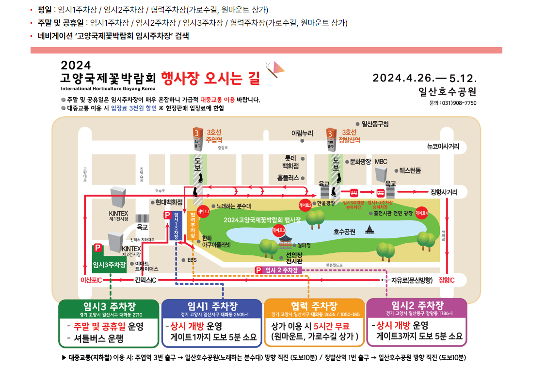 고양국제꽃박람회에서는 탄소 중립 사회 전환을 위해 대중교통(마을버스 포함) 이용 방문자는 현장 입장권 3,000원 할인됩니다. 대중교통 이용 시 사용한 교통카드를 제시하면 대중교통 이용을 확인할 수 있는 단말기를 통해 대중교통 할인이 적용됩니다. 단, 고양시민 예매권, 얼리버드 입장권 등 할인권은 제외된다고 하니 대중교통 이용하시어 제공되는 혜택들을 모두 누려보시길 바랍니다.