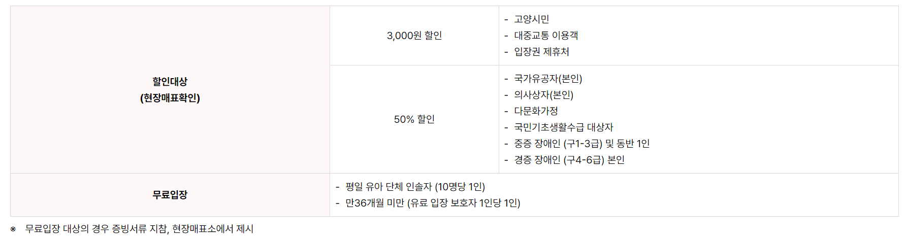 - 국가유공자, 의사상자, 다문화가정, 국민기초생활수급대상자, 장애인 : 현장판매 성인권, 어린이·청소년·만 65세 이상권에서 50%할인 적용