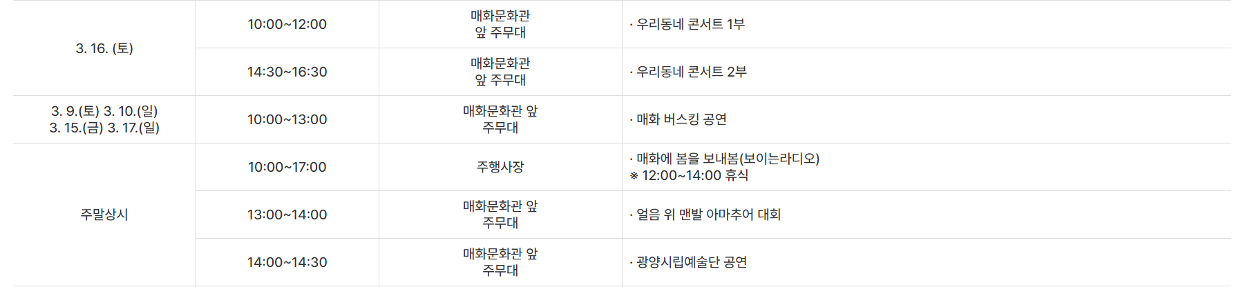 또한 쾌적한 축제장 마련을 위해 최초 축제장 유료화(전액 축제상품권 환급), 차 없는 거리 등을 시도하며 1박2일 프로그램, 매실 하이볼 체험, 나만의 공간 매화나무 아래, 섬진강 맨발(얼음길) 걷기 등 광양매화축제에서만 즐길 수 있는 킬러콘텐츠를 대거 도입한다고 합니다. 올해 첫 꽃축제인 광양매화축제에서 아름다운 매화꽃을 만나보세요~^^