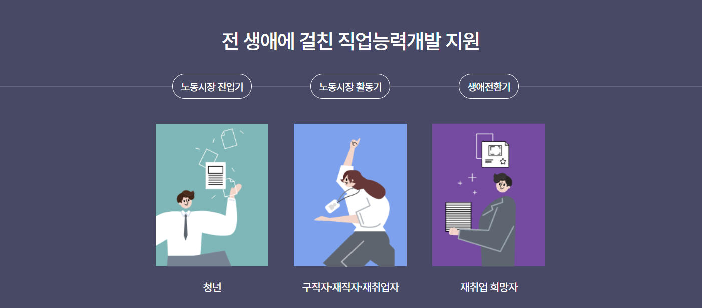 국민내일배움카드는 전 생애에 걸친 국민의 직업능력개발을 지원하기 위한 제도입니다. 일자리를 구하고 있는 취업준비생, 다른 분야에 관심이 가는 이직 희망자, 업무역량을 향상시키고 싶은 회사원, 새로운 경력을 다시 써 내려갈 여성들까지 필요한 열량 개발을 카드 한 장으로 가능하다고 합니다.