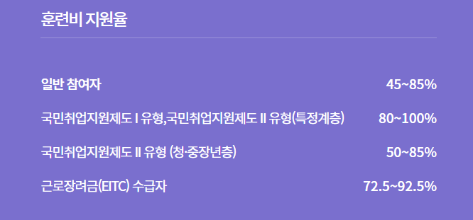 지원 범위 내에서 훈련비의 45~85%가 국비지원되며 훈련에 참가하는 훈련생의 유형에 따라 훈련비 지원율은 상이합니다.