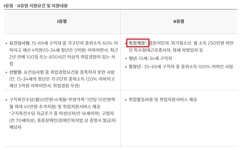 지원대상은 참여자의 소득과 재산등에 따라 2가지 유형(Ⅰ유형, Ⅱ유형)으로 분류됩니다.
