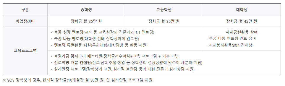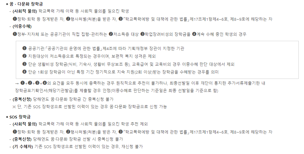- SOS 장학금 : 선발 자격요건을 갖춘 학생으로, 긴급한 위기상황에 처했으나 학업을 지속할 의지가 있는 학생(학교별 추천인원 제한 없음)