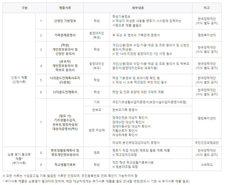 - 모든 서류는 학생이 멘토 교사에게 제출하고, 멘토 교사는 한국장학재단 학자금지원시스템(관리자포탈)에 업로드