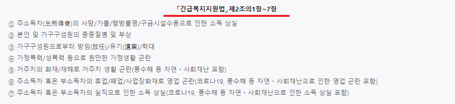 긴급구난사유 : 「긴급복지지원법」 제2조 1항 ~7항에 해당하거나 이에 준하는 긴급위기상황이 발생하여 학업을 지속하기 곤란한 학생