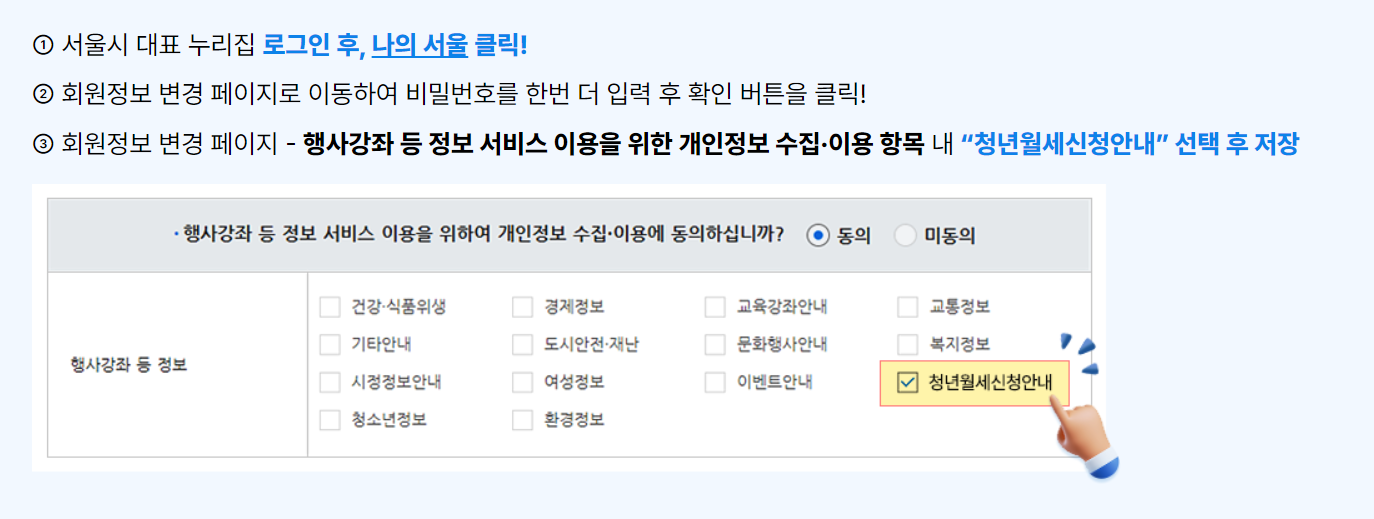 - 지원방법 : 서울주거포털 '청년월세지원' 란에서 지원 신청 후 마이페이지에서 신청확인