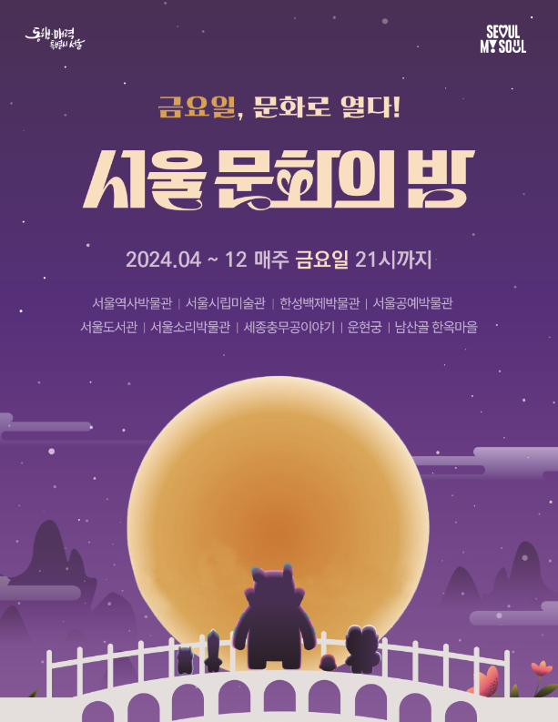 서울 문화의 밤(Seoul Open Night)은 심야까지 서울 주요지역의 박물관, 미술관, 공연장 등 문화예술시설을 연장 개방하고 각종 문화프로그램을 운영하여, 서울시민과 국내·외 관광객이 서울의 야간문화를 체험할 수 있는 문화예술행사로 2008년 최초로 시행되었습니다. 초기에는 서울광장 및 5개 지구(정동, 북촌, 인사동, 대학로, 홍대)에 대한 야간 문화시설 개방 및 지구별 특색 있는 프로그램으로 구성 및 운영하였습니다. 오늘은 4월부터 12월까지,매주 금요일 21시까지 운영하는 서울문화의 밤에 대해 알아보겠습니다.