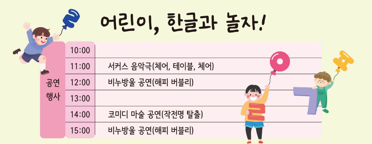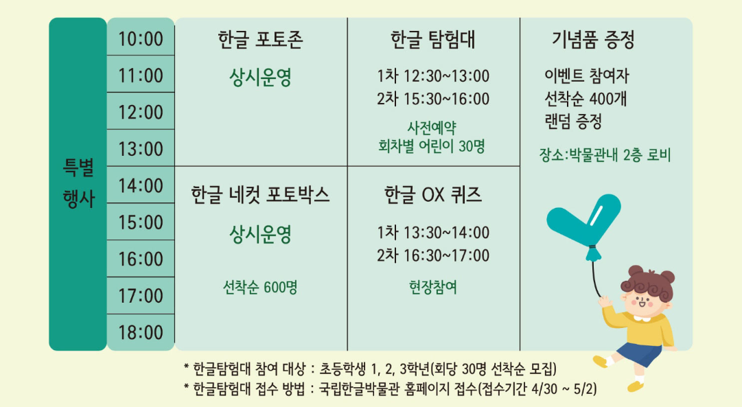 - 국립한글박물관은 공연, 체험, 특별행사로 진행되며 한글탐험대 프로그램은 사전예약 후 이용하실 수 있습니다.