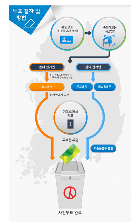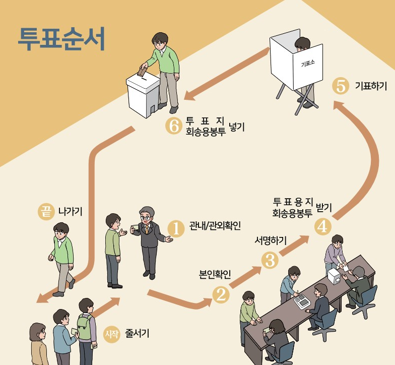 - 줄서기 → 관내/ 관외 확인 → 본인확인 → 서명하기 → 투표용지/회송용봉투받기 → 기표하기 → 투표지/회송용봉투넣기 → 나가기