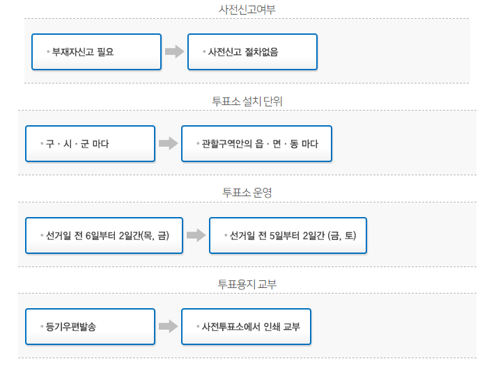 유권자의 관내에서 하지 않아도 된다는 점은 부재자 투표와 닮았지만 부재자 투표와는 본질적으로 다릅니다.