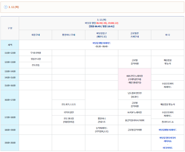 진도출신 트롯여왕 송가인의 개막식 무대를 시작으로 바닷길 걷는 체험, 횃불퍼레이드, 레이저쇼, 사랑의 콘테스트 뿐만아니라 북놀이, 진도아리랑, 전통 국악기 만들기, 특산물 시식 체험, 사진 전시회등 볼거리 즐길거리가 많이 준비되어 있다고 합니다. '사랑의 콘테스트' 베스트 커플 5쌍에게는 금반지(1돈)을 증정한다고 하니 사랑을 고백하고 싶은 연인, 부부라면 참여하는것도 좋을것 같습니다. 또한 12일 13:00부터 KBS전국 노래자랑 촬영도 진행된다고 하니 아래 세부일정표를 참고하시길 바랍니다.