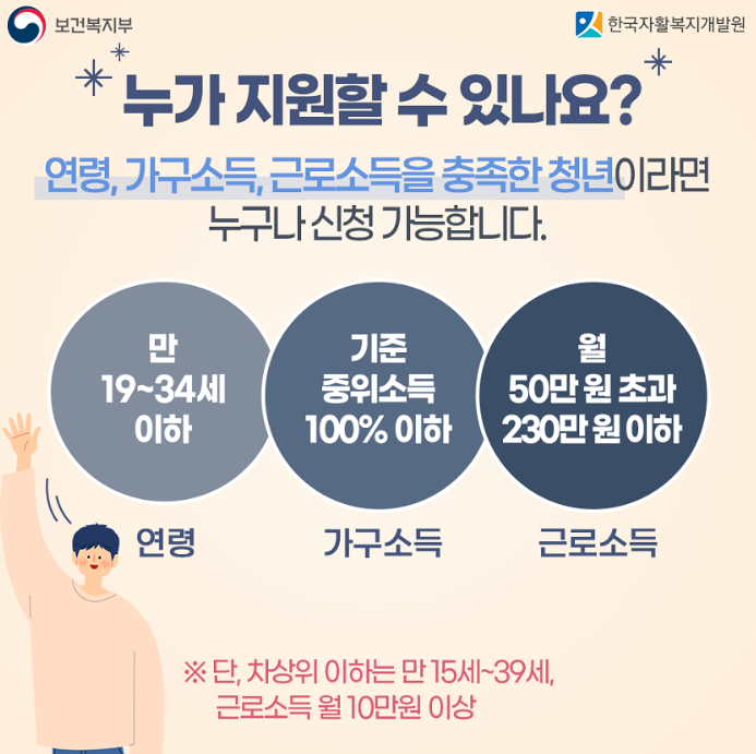 - 단, 수급자, 차상위자, 기준 중위소득 50% 이하자는 만 15세 ~ 만 39세까지 허용 (신청 월의 전월에 만 15세가 된 자 ~ 신청 월에 만 40세가 되는 자)