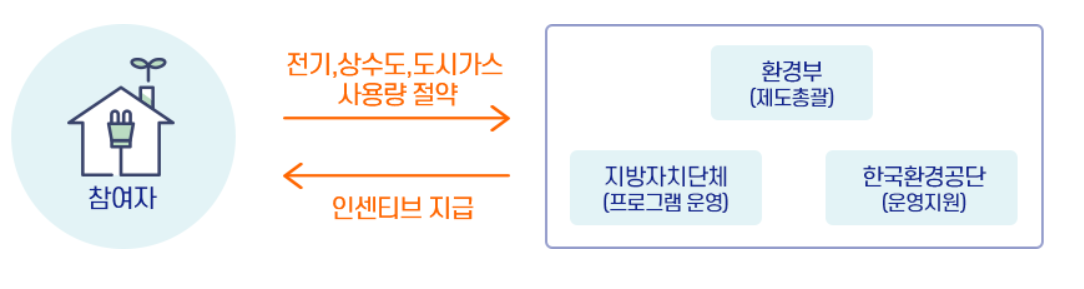 참여자(가정, 단체)가 전기, 상수도, 도시가스 사용량을 절약하면 환경부, 지방자치단체, 한국환경공단에서 인센티브를 지급하는 체계입니다.