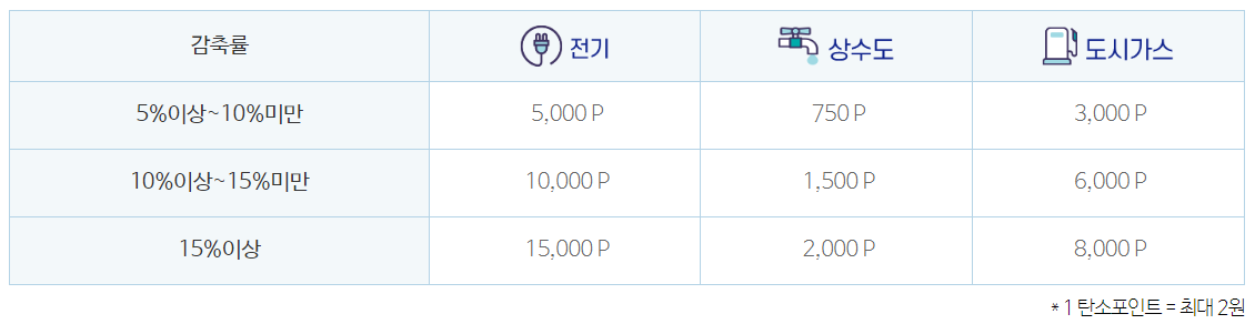 가정 내 사용하는 에너지 항목(전기, 상수도, 도시가스)을 과거 1~2년간 월별 평균 사용량과 현재 사용량을 비교하여 절감비율에 따라 탄소포인트를 부여