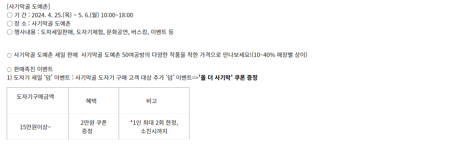 - 축제장소 : 이천도자기예술마을(예스파크), 사기막골 도예촌, 온라인홈페이지(이천도자기축제)